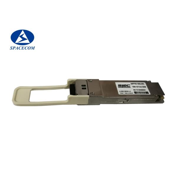SPACECOM QSFP28 100G ZR4 transceiver module designed for optical communication applications compliant to 100GBASE-ZR4 of the IEEE P802.3ba standard. The module converts 4 input channels of 25Gb/s electrical data to 4 channels of LAN WDM optical signals and then multiplexes them into a single channel for 100Gb/s optical transmission.